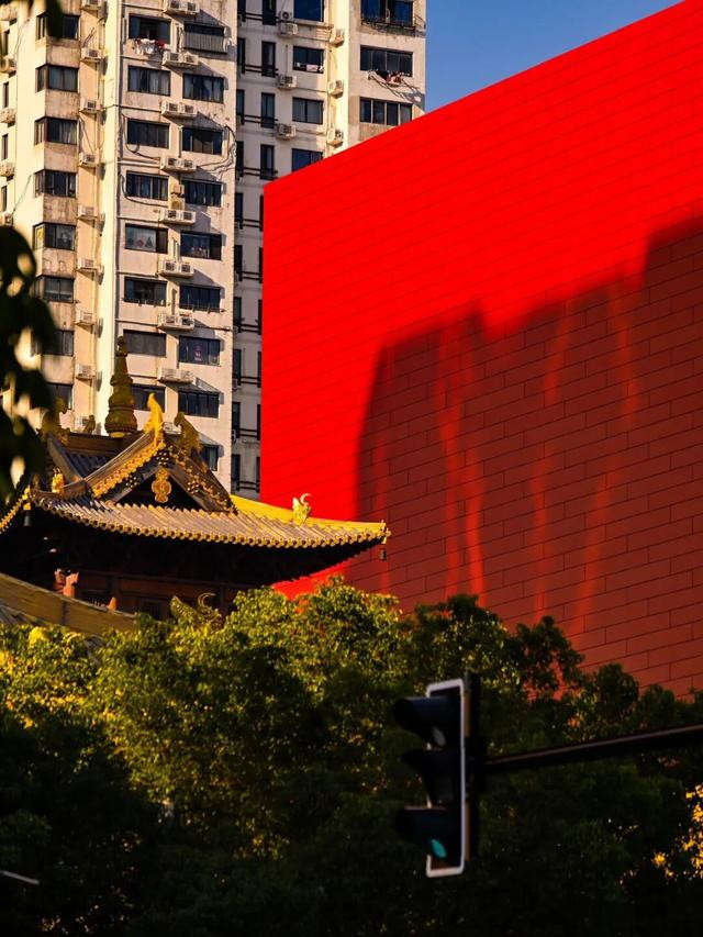 久光百货坐落于南京西路1618号,与静安寺、静安公园相映成辉,成为商圈内自带法式复古滤镜的热门打卡点。红墙以细腻规整的红砖纹理出圈,黄昏时分余晖漫洒墙面,暖光与静安寺古建轮廓交相呼应,历史韵味与现代美感完美融合。